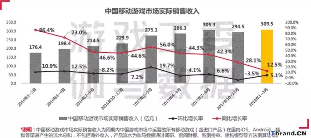 从游戏工委和伽马传媒发布的另外一份数据《2018年1-3月移动游戏报告》当中可以看到,在没有版号影响的今年1-3月,移动游戏的同比增长为12.5%,这个数据是历年的新低,从趋势图也可以看到,同比的增速一直在下滑。