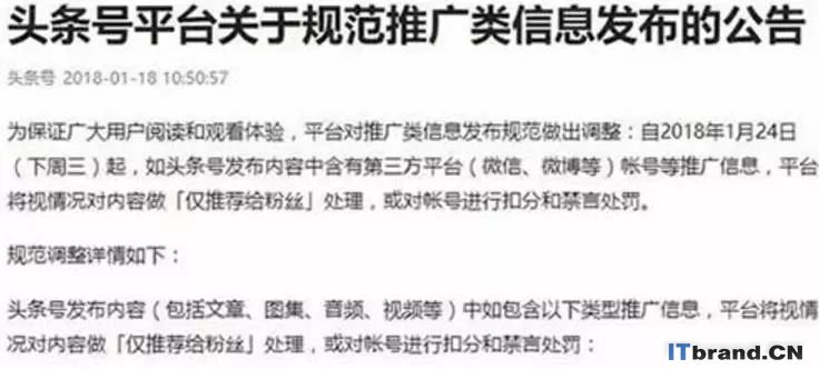我们要讨论的是,今日头条一开始就不允许出现任何微信公众号二维码的事实,而在今年1月24日,今日头条官方头条号发布的一则公告,自2018年1月24日起,禁止推广微信、微博等第三方平台账户,触犯规则或对账户进行扣分和禁言处罚。