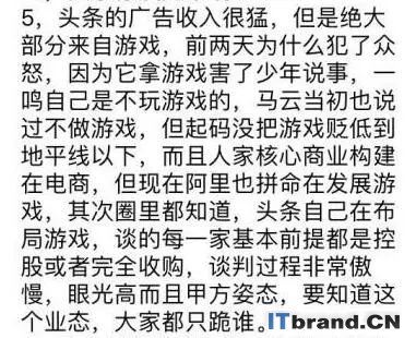 而在陈书艺的这条朋友圈当中,实际上还提到了另外一点,头条在和游戏厂商谈判过程非常傲慢,眼光高而且甲方姿态。